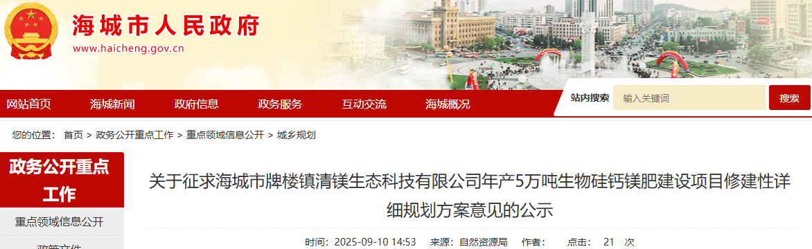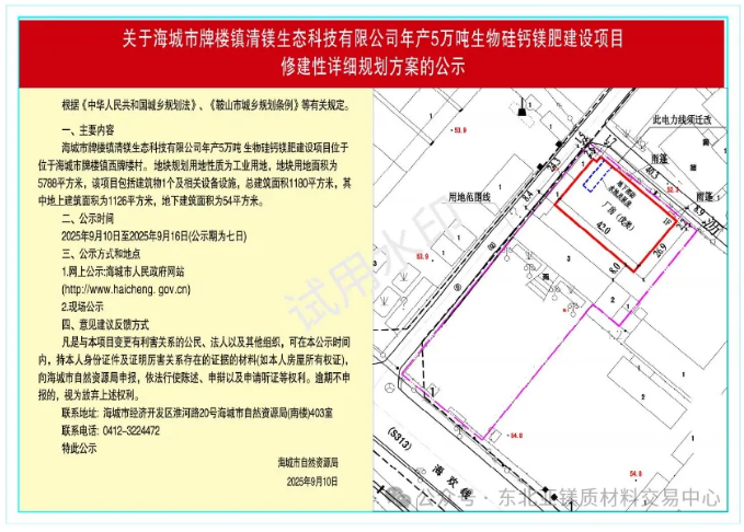 為切實增強規(guī)劃的科學性、合理性和可行性,征求公眾意見,根據(jù)《中華人民共和國城鄉(xiāng)規(guī)劃法》第二十六條規(guī)定,現(xiàn)將海城市牌樓鎮(zhèn)清鎂生態(tài)科技有限公司年產(chǎn)5萬噸生物硅鈣鎂肥建設(shè)項目修建性詳細規(guī)劃方案內(nèi)容公告如下: