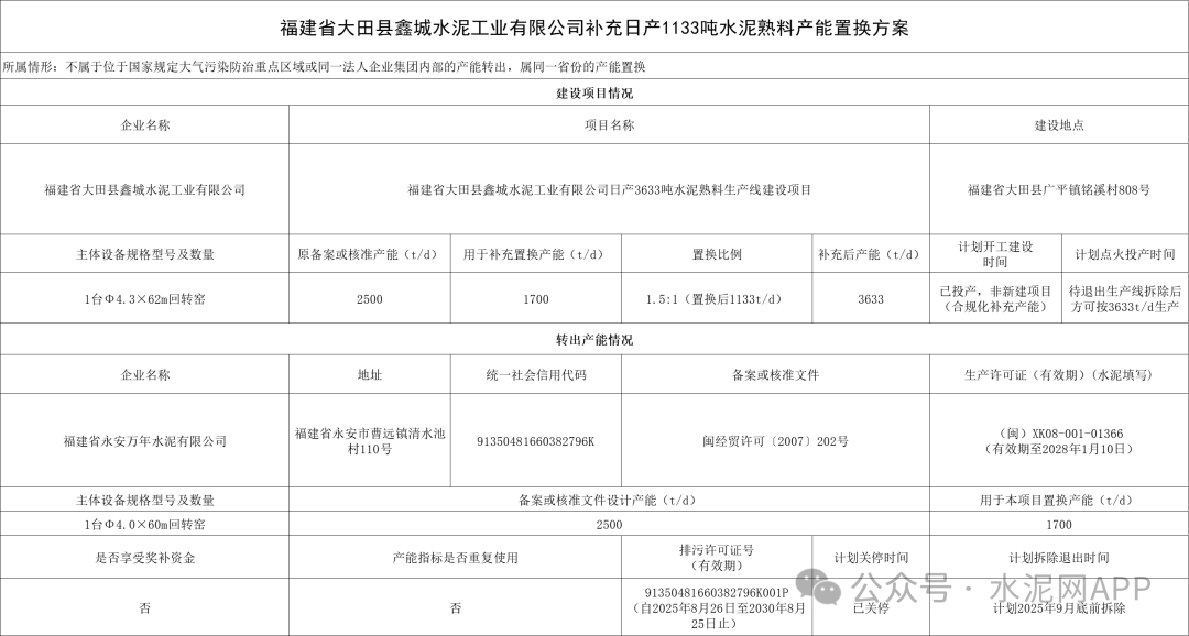 置換方案顯示,福建省大田縣鑫城水泥2500t/d補(bǔ)充產(chǎn)能1700t/d,補(bǔ)充后產(chǎn)能為3633t/d,退出產(chǎn)能來自福建省永安萬(wàn)年水泥一條2500t/d熟料生產(chǎn)線(用于本項(xiàng)目1700t/d),置換比例1.5:1。
