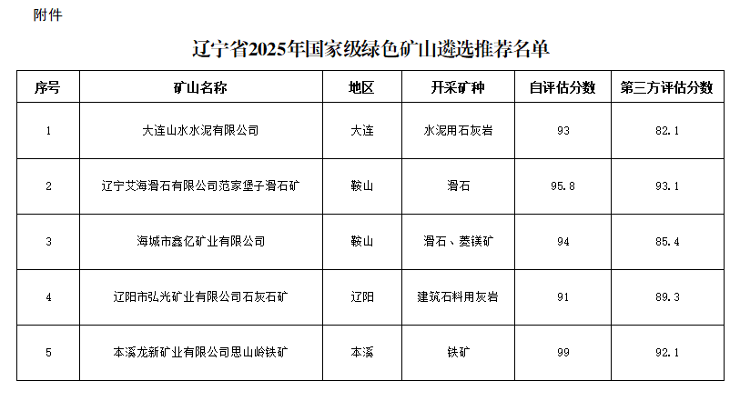 按照《關(guān)于進一步加強綠色礦山建設(shè)的通知》(自然資規(guī)〔2024〕1號)和《自然資源部辦公廳關(guān)于開展新一批國家級綠色礦山遴選工作的通知》(自然資辦發(fā)〔2025〕8號)相關(guān)要求,遼寧省自然資源廳嚴格組織開展國家級綠色礦山遴選推薦工作。經(jīng)企業(yè)自主申報、省廳綜合評審,現(xiàn)擇優(yōu)確定5家企業(yè)作為2025年國家級綠色礦山遴選推薦對象,具體名單詳見附件。