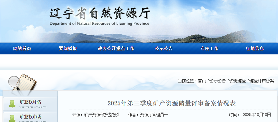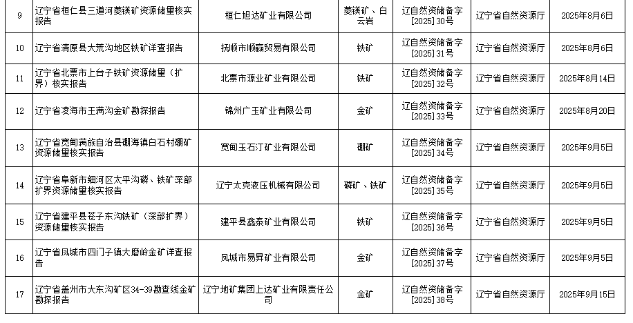 遼寧省2025年第三季度礦產(chǎn)資源儲(chǔ)量評(píng)審備案情況表