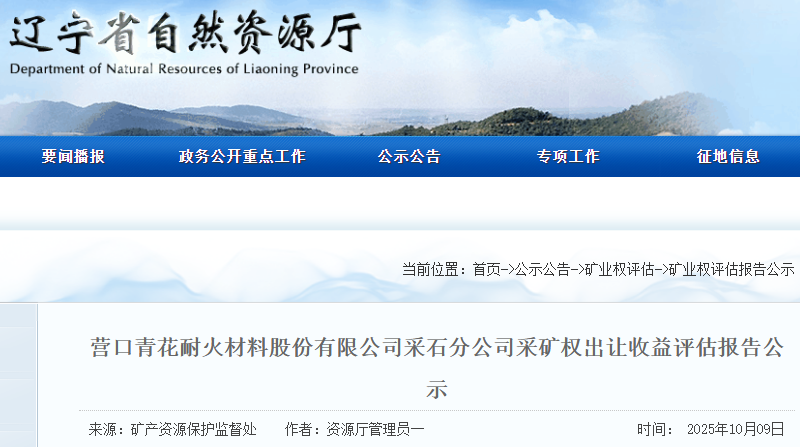 營口青花耐火材料股份有限公司采石分公司采礦權(quán)出讓收益評估報告通過遼寧省自然資源廳門戶網(wǎng)站向社會公示,公示10個工作日。如有異議,請于公示之日起10個工作日內(nèi)以電話方式先向省自然資源廳礦產(chǎn)資源保護監(jiān)督處提出簡要意見,隨后及時將書面意見反饋到省自然資源廳礦產(chǎn)資源保護監(jiān)督處。