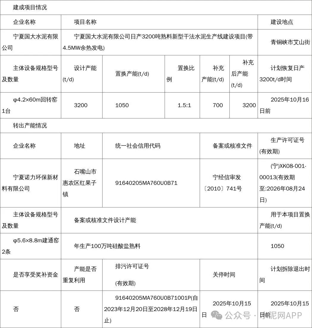 9月29日,寧夏回族自治區(qū)工業(yè)和信息化廳發(fā)布公告,按照工業(yè)和信息化部《水泥玻璃行業(yè)產(chǎn)能置換實(shí)施辦法(2024年本)》(工信部原〔2024〕206號(hào))有關(guān)要求,經(jīng)現(xiàn)場(chǎng)核查驗(yàn)收,寧夏諾力環(huán)保新材料有限公司產(chǎn)能出讓轉(zhuǎn)移至寧夏國(guó)大水泥有限公司的水泥熟料生產(chǎn)線(xiàn),主體設(shè)備已拆除,不具備恢復(fù)生產(chǎn)熟料能力,現(xiàn)予公告。