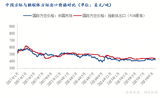 圖一:2023-2025年中國(guó)鋼坯與獨(dú)聯(lián)體方坯出口價(jià)格對(duì)比