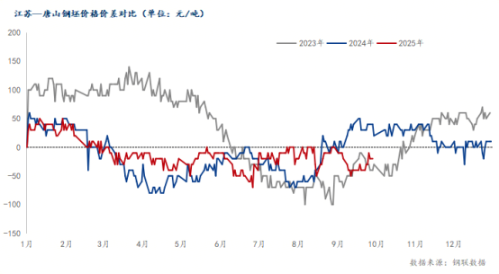 截至9月29日,唐山鋼坯出廠價(jià)報(bào)2970元/噸,較8月末下調(diào)30元/噸;江陰市場(chǎng)報(bào)3010元/噸,累計(jì)下調(diào)50元/噸。9月鋼坯價(jià)格先強(qiáng)后弱,上旬在宏觀利好情緒帶動(dòng)下,期貨震蕩上行,同時(shí)下游調(diào)坯軋鋼企業(yè)積極生產(chǎn),鋼坯需求量持續(xù)增加,鋼坯社會(huì)庫(kù)存降庫(kù)速度較快。但隨著調(diào)坯廠持續(xù)虧損,并且成品材成交較緩,庫(kù)存壓力較大,自主停產(chǎn)增加,采坯意愿不斷走弱。市場(chǎng)交易多集中在貿(mào)易環(huán)節(jié),期現(xiàn)基差波動(dòng)較小。此外,南北價(jià)差較小暫無(wú)跨區(qū)域流通。