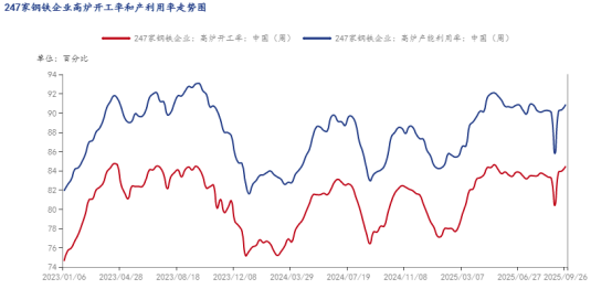 圖五:2023-2025年國(guó)內(nèi)247家鋼鐵企業(yè)高爐開工率和產(chǎn)能利用率走勢(shì)圖