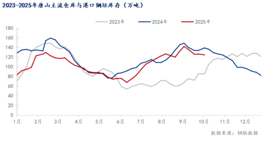 圖七:2023-2025年唐山主流倉(cāng)庫(kù)與鋼坯庫(kù)存