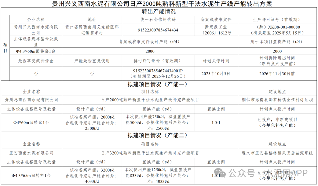 產(chǎn)能置換方案顯示,貴州興義西南水泥轉(zhuǎn)出一條2000t/d熟料產(chǎn)能,其中750t/d用于補(bǔ)充貴州思南西南水泥,1250t/d用于補(bǔ)充正安西南水泥,置換比例1.5:1。