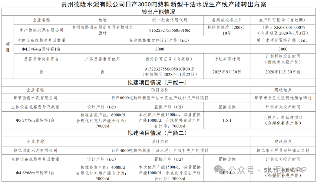 置換方案顯示,貴州德隆水泥(隸屬天山材料)轉(zhuǎn)出一條3000t/d熟料產(chǎn)能,其中1500t/d用于畢節(jié)西南水泥,另外1500t/d用于銅仁西南水泥,置換比例1.5:1。