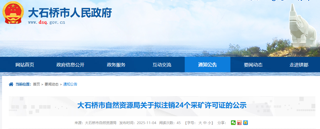 大石橋市南樓經(jīng)濟開發(fā)區(qū)工農(nóng)興旺建筑石礦等24個采礦許可證,礦業(yè)權(quán)人在有效期屆滿前未按規(guī)定申請辦理延續(xù)登記,采礦許可證已自行廢止。根據(jù)《礦產(chǎn)資源開采登記管理辦法》(國務(wù)院令第241號)和《自然資源部關(guān)于進一步完善礦產(chǎn)資源勘查開采登記管理的通知》(自然資規(guī)[2023]4號)第十八條,大石橋市自然資源局擬對上述采礦許可證予以注銷,現(xiàn)進行公示。