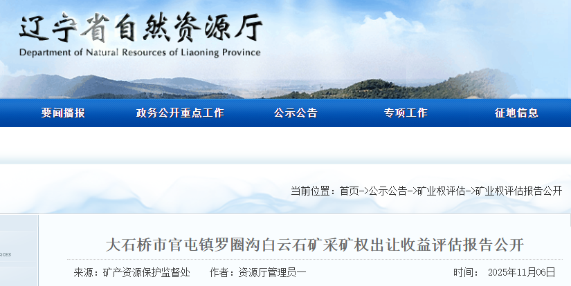 按照《關(guān)于完善礦業(yè)權(quán)出讓收益評估程序的通知》(遼自然資辦發(fā)[2022]2號)要求,《大石橋市官屯鎮(zhèn)羅圈溝白云石礦采礦權(quán)出讓收益評估報告》及相關(guān)附件已在省自然資源廳公示10個工作日,無異議,予以公開。