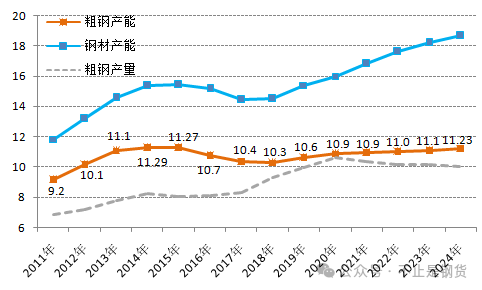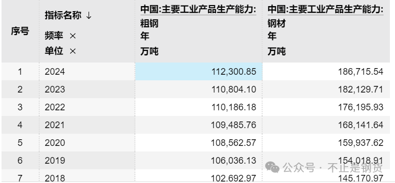 全國(guó)鋼材產(chǎn)能在2024年再創(chuàng)歷史峰值至18.7億噸、較2018年增加4.3億噸,較2015年增加3.3億噸。
