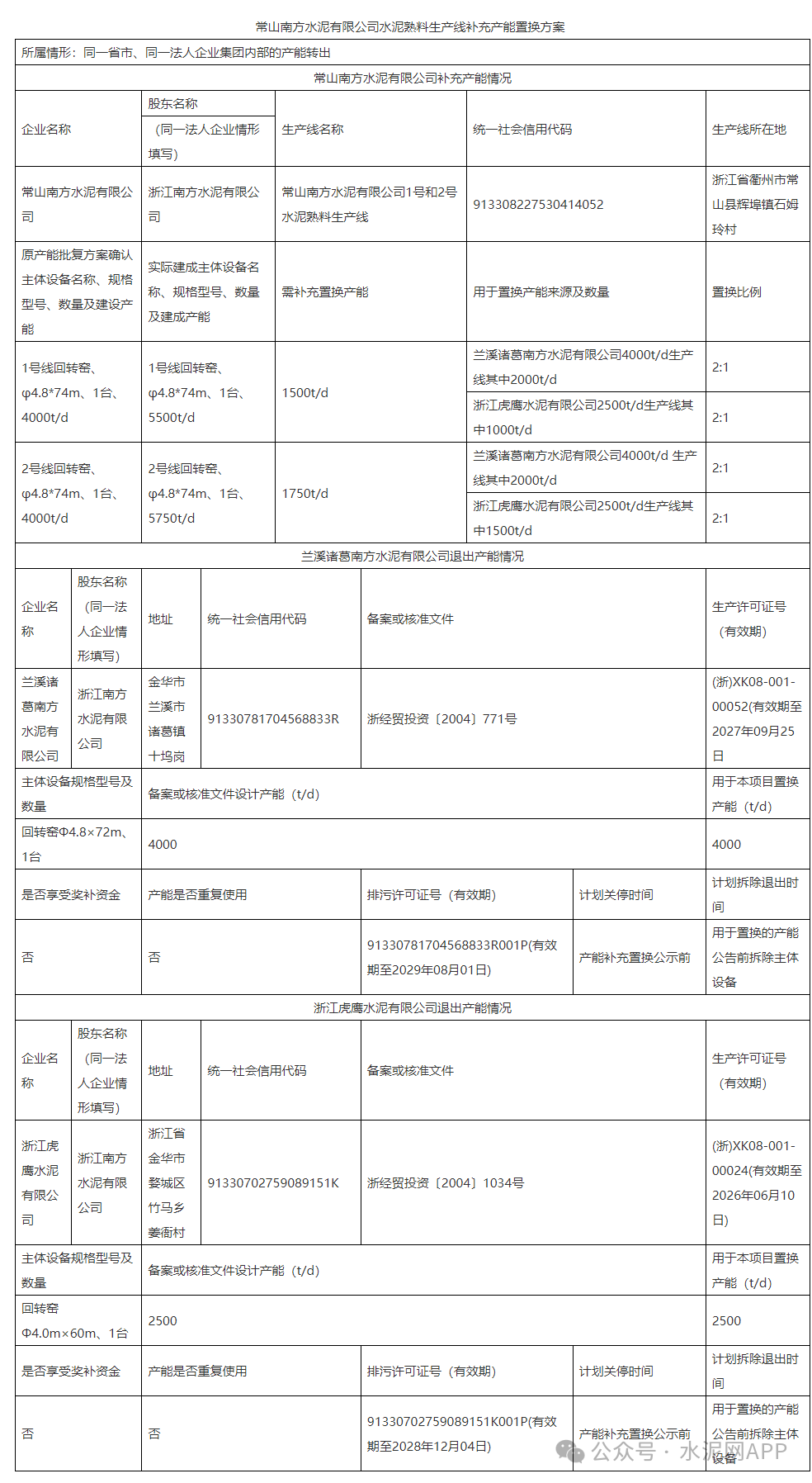 置換方案顯示,常山南方1號線回轉(zhuǎn)窯補充熟料產(chǎn)能1500t/d,2號線回轉(zhuǎn)窯補充熟料產(chǎn)能1750t/d,置換退出產(chǎn)能來自蘭溪諸葛南方一條4000t/d熟料生產(chǎn)線及浙江虎鷹水泥一條2500t/d熟料生產(chǎn)線,置換比例2:1。