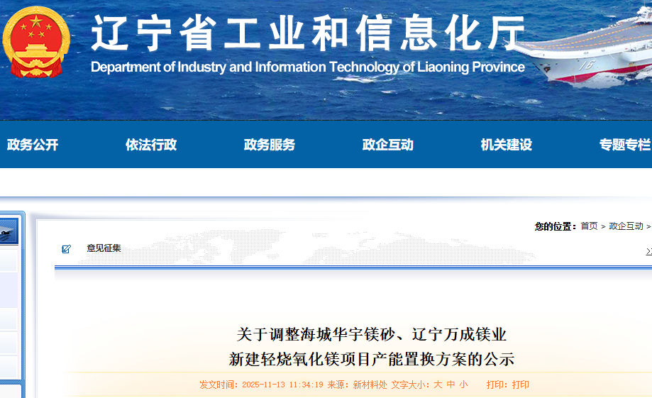 遼寧省工信廳2025年6月19日《關(guān)于海城鎂礦集團(tuán)有限公司等企業(yè)新建輕燒氧化鎂項(xiàng)目產(chǎn)能置換方案的通告》中海城華宇鎂砂有限公司一期新建年產(chǎn)10萬(wàn)噸輕燒氧化鎂懸浮窯建設(shè)項(xiàng)目產(chǎn)能置換方案、海城華宇鎂砂有限公司二期新建年產(chǎn)10萬(wàn)噸輕燒氧化鎂懸浮窯建設(shè)項(xiàng)目產(chǎn)能置換方案、遼寧萬(wàn)成鎂業(yè)集團(tuán)有限公司年產(chǎn)20萬(wàn)噸新建輕燒氧化鎂回轉(zhuǎn)窯項(xiàng)目產(chǎn)能置換方案擬撤銷。