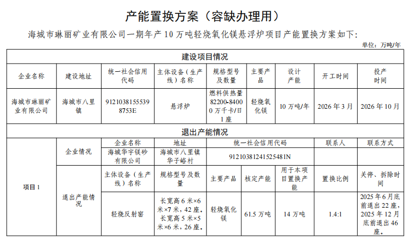 1.海城市琳麗礦業(yè)有限公司一期年產(chǎn)10萬(wàn)噸輕燒氧化鎂懸浮爐項(xiàng)目產(chǎn)能置換方案
