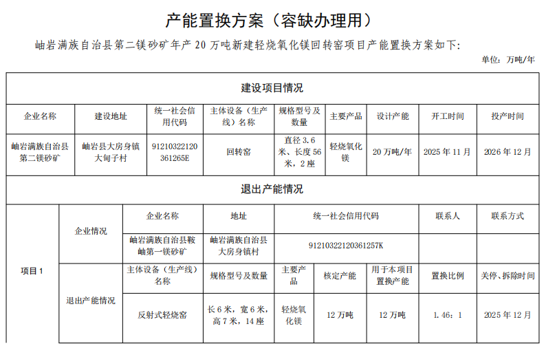 3.岫巖滿族自治縣第二鎂砂礦年產(chǎn)20萬(wàn)噸新建輕燒氧化鎂回轉(zhuǎn)窯項(xiàng)目產(chǎn)能置換方案