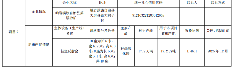 2.海城市琳麗礦業(yè)有限公司二期年產(chǎn)10萬(wàn)噸輕燒氧化鎂懸浮爐項(xiàng)目產(chǎn)能置換方案