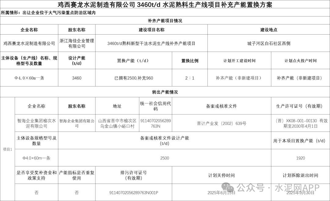 置換方案顯示,雞西賽龍水泥制造有限公司一條2500t/d熟料生產(chǎn)線補(bǔ)充產(chǎn)能960t/d,補(bǔ)充后產(chǎn)能3460t/d,退出產(chǎn)能來自智海企業(yè)集團(tuán)榆次水泥有限公司一條2500t/d熟料線(用于本項(xiàng)目1920t/d),置換比例2:1。
