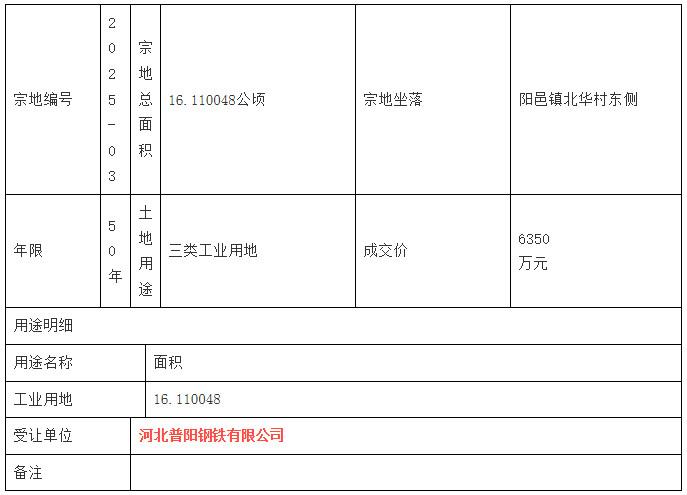 近日,河北普陽鋼鐵有限公司以6350萬元成功競得武安市陽邑鎮(zhèn)北華村東側(cè)一宗工業(yè)用地,總面積達(dá)16.110048公頃,使用年限50年。該地塊通過公開掛牌方式出讓,符合《中華人民共和國土地管理法》等相關(guān)法規(guī)要求。