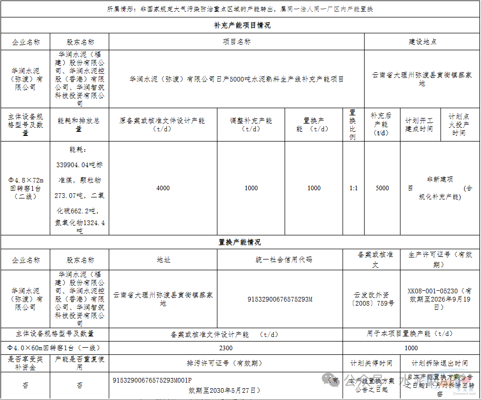 華潤(rùn)水泥(彌渡)一條4000t/d熟料生產(chǎn)線補(bǔ)充產(chǎn)能1000t/d,補(bǔ)齊后產(chǎn)能5000t/d,退出產(chǎn)能來(lái)自同廠區(qū)另一條2300t/d熟料線(1000t/d用于本項(xiàng)目),置換比例1:1。