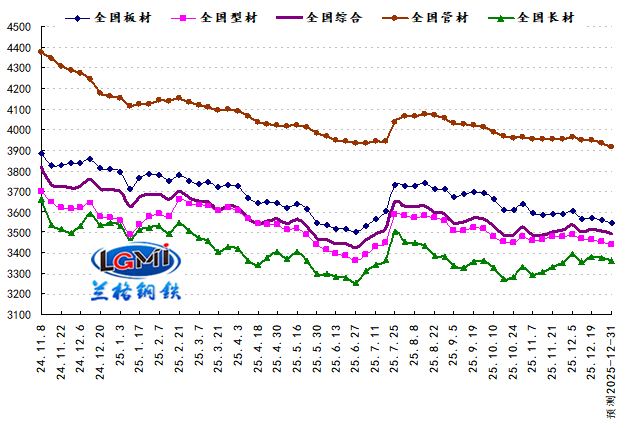 2025年第52周(2025.12.22-12.26)蘭格鋼鐵全國絕對價格指數(shù)為3505元,較上周下降0.3%,較去年同期下降5.6%;其中,蘭格鋼鐵長材絕對價格指數(shù)為3377元,較上周下降0.2%,較去年同期下降4.9%;蘭格鋼鐵型材絕對價格指數(shù)為3453元,較上周下降0.4%,較去年同期下降3.3%;蘭格鋼鐵板材絕對價格指數(shù)為3560元,較上周下降0.3%,較去年同期下降6.6%;蘭格鋼鐵管材絕對價格指數(shù)為3931元,較上周下降0.4%,較去年同期下降5.7%。