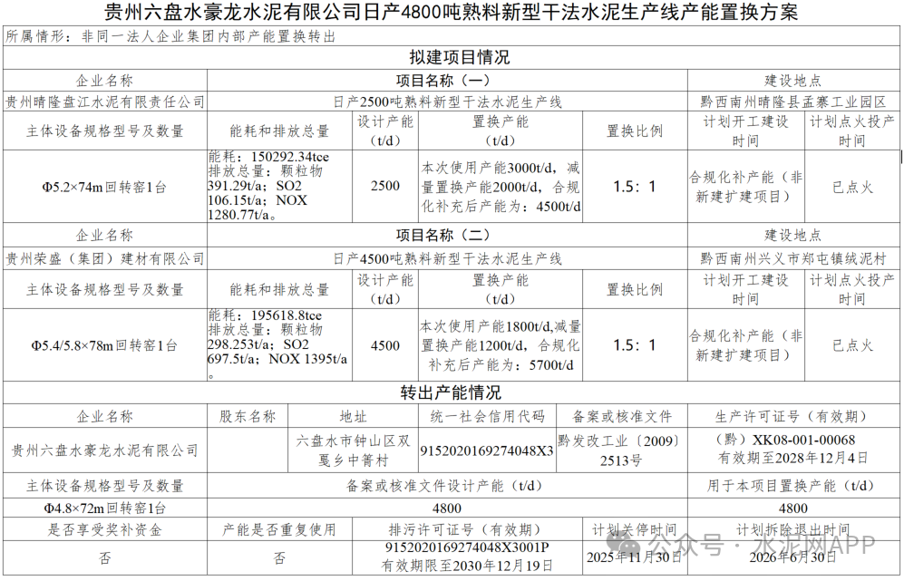 2025年12月31,貴州省工信廳發(fā)布“關(guān)于貴州六盤水豪龍水泥有限公司日產(chǎn)4800噸熟料新型干法水泥生產(chǎn)線產(chǎn)能置換方案的公示”。