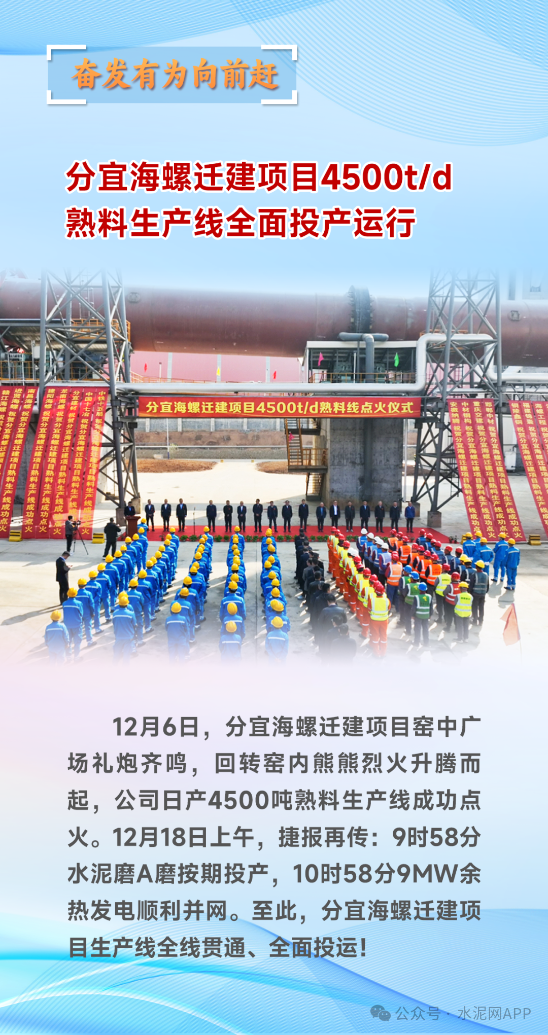 據(jù)海螺集團(tuán)發(fā)布,12月6日,分宜海螺遷建項(xiàng)目窯中廣場(chǎng)禮炮齊鳴,回轉(zhuǎn)窯內(nèi)熊熊烈火升騰而起,公司日產(chǎn)4500噸熟料生產(chǎn)線成功點(diǎn)火。12月18日上午,捷報(bào)再傳:9時(shí)58分水泥磨A磨按期投產(chǎn),10時(shí)58分9MW余熱發(fā)電順利并網(wǎng)。至此,分宜海螺遷建項(xiàng)目生產(chǎn)線全線貫通、全面投運(yùn)!