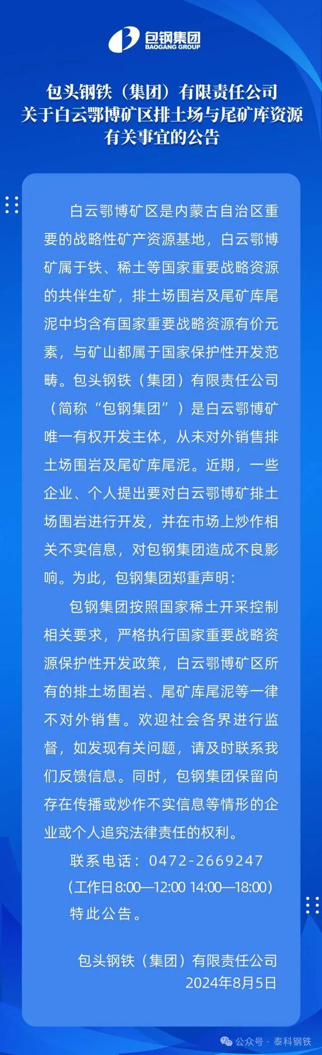 8月5日,包鋼集團發(fā)布關(guān)于白云鄂博礦區(qū)排土場與尾礦庫資源有關(guān)事宜的公告。公告指出,近期,一些企業(yè)、個人提出要對白云鄂博礦排土場圍巖進行開發(fā),并在市場上炒作相關(guān)不實信息,對包鋼集團造成不良影響。包鋼集團按照國家稀土開采控制相關(guān)要求,嚴格執(zhí)行國家重要戰(zhàn)略資源保護性開發(fā)政策,白云鄂博礦區(qū)所有的排土場圍巖、尾礦庫尾泥等一律不對外銷售。
