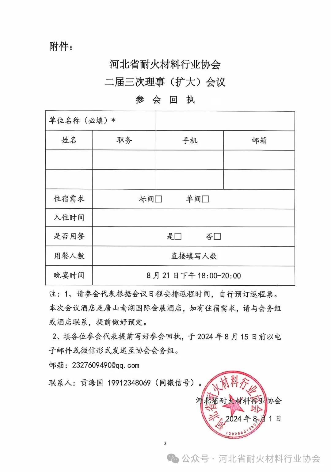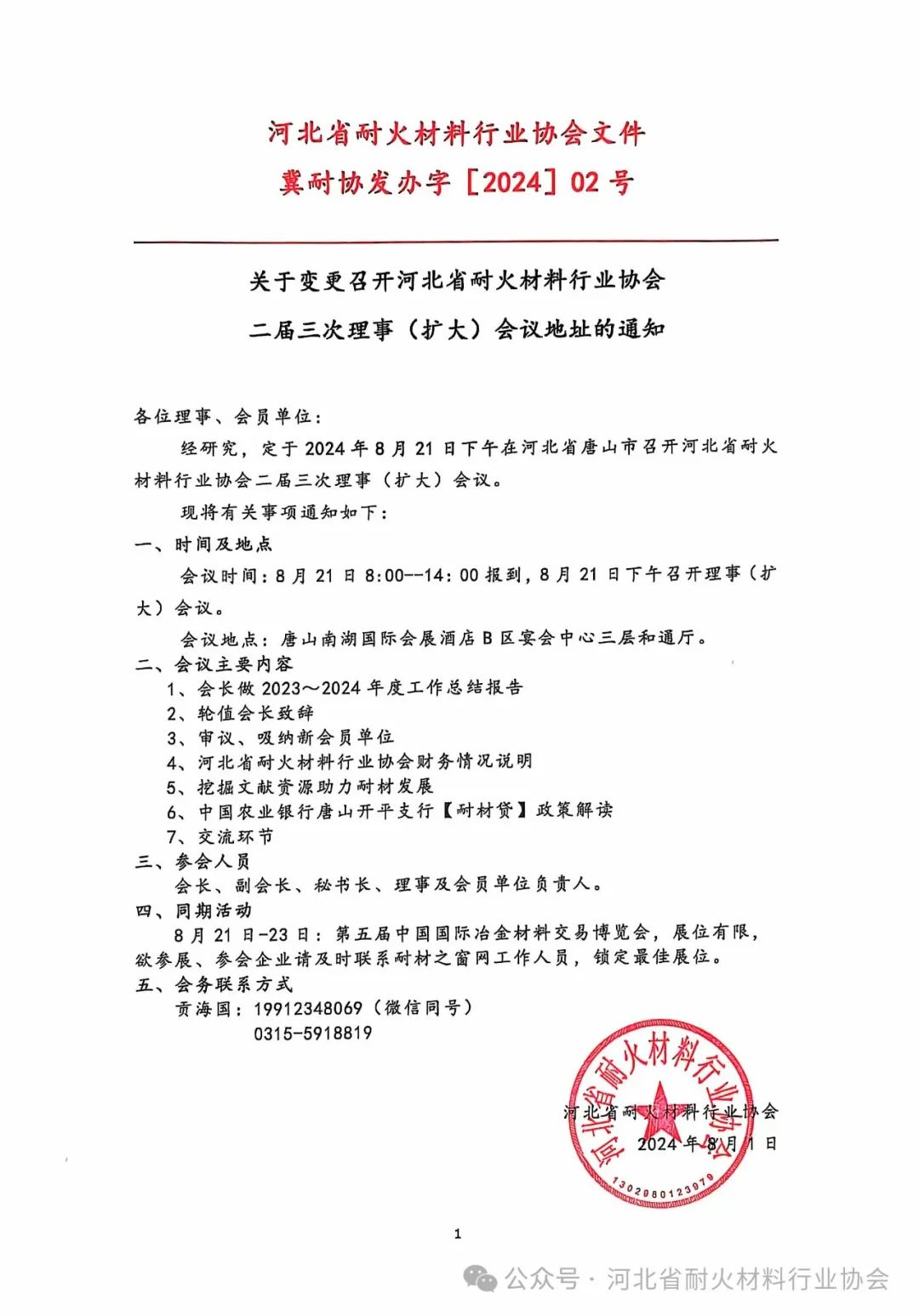 關(guān)于變更召開河北省耐火材料行業(yè)協(xié)會二屆三次理事(擴(kuò)大)會議地址的通知