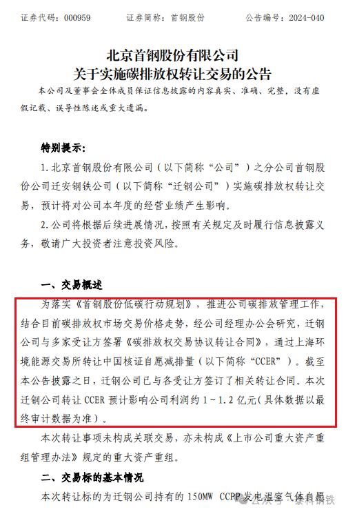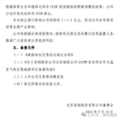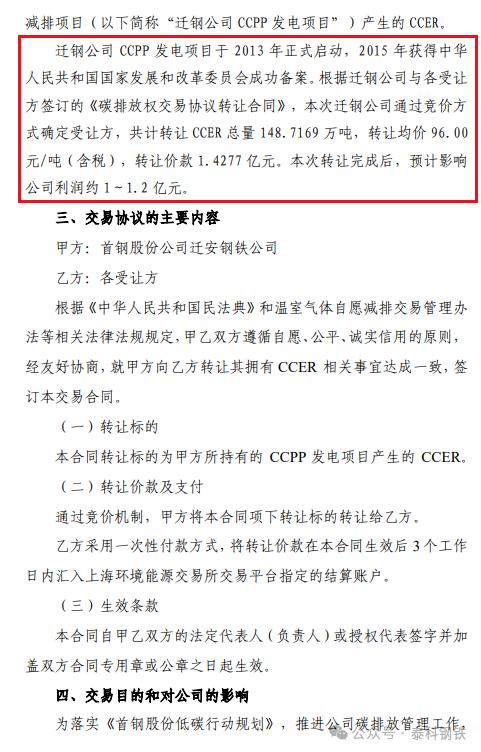 首鋼股份9月10日公告,公司之分公司首鋼股份公司遷安鋼鐵公司(以下簡(jiǎn)稱“遷鋼公司”)實(shí)施碳排放權(quán)轉(zhuǎn)讓交易,預(yù)計(jì)將對(duì)公司本年度的經(jīng)營(yíng)業(yè)績(jī)產(chǎn)生影響。遷鋼公司CCPP發(fā)電項(xiàng)目于2013年正式啟動(dòng),2015年獲得中華 人民共和國(guó)國(guó)家發(fā)展和改革委員會(huì)成功備案。根據(jù)遷鋼公司與各受讓方簽訂的《碳排放權(quán)交易協(xié)議轉(zhuǎn)讓合同》,本次遷鋼公司通過競(jìng)價(jià)方式確定受讓方,共計(jì)轉(zhuǎn)讓CCER總量148.7169萬噸,轉(zhuǎn)讓均價(jià)96.00元/噸(含稅),轉(zhuǎn)讓價(jià)款1.4277億元。本次轉(zhuǎn)讓完成后,預(yù)計(jì)影響公司利潤(rùn)約1~1.2億元。